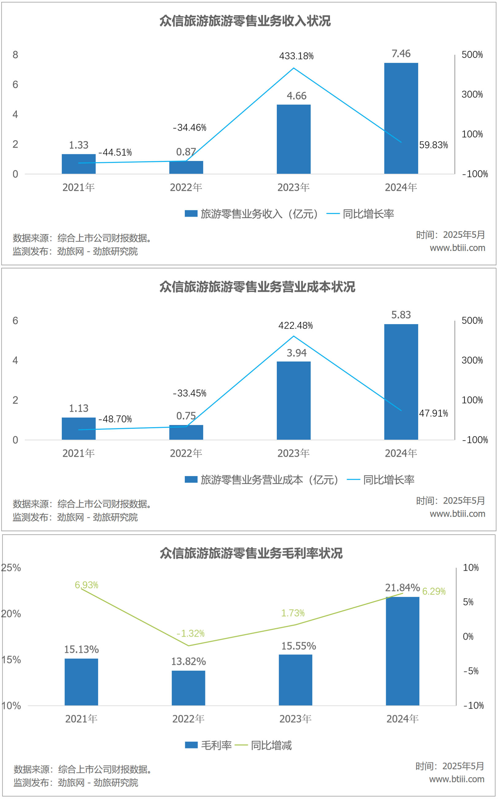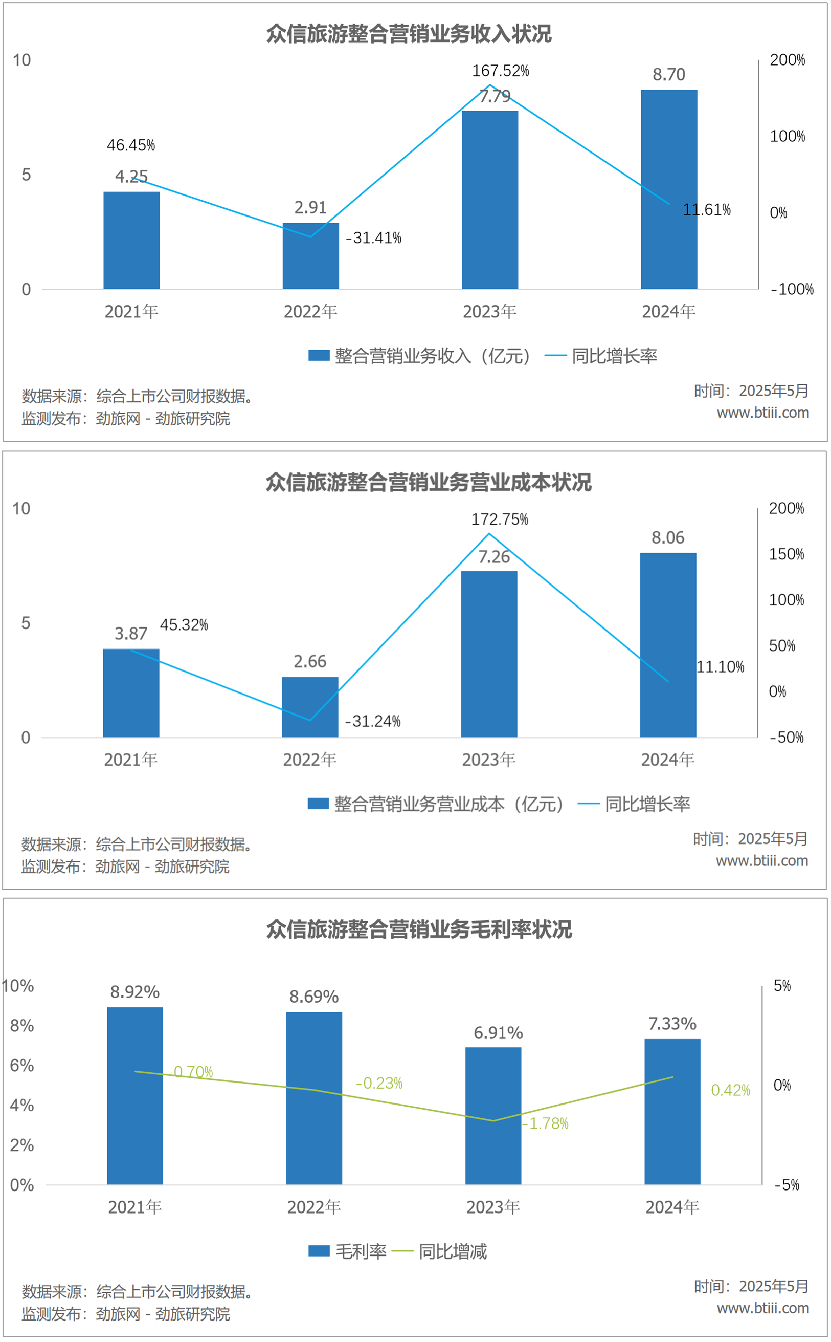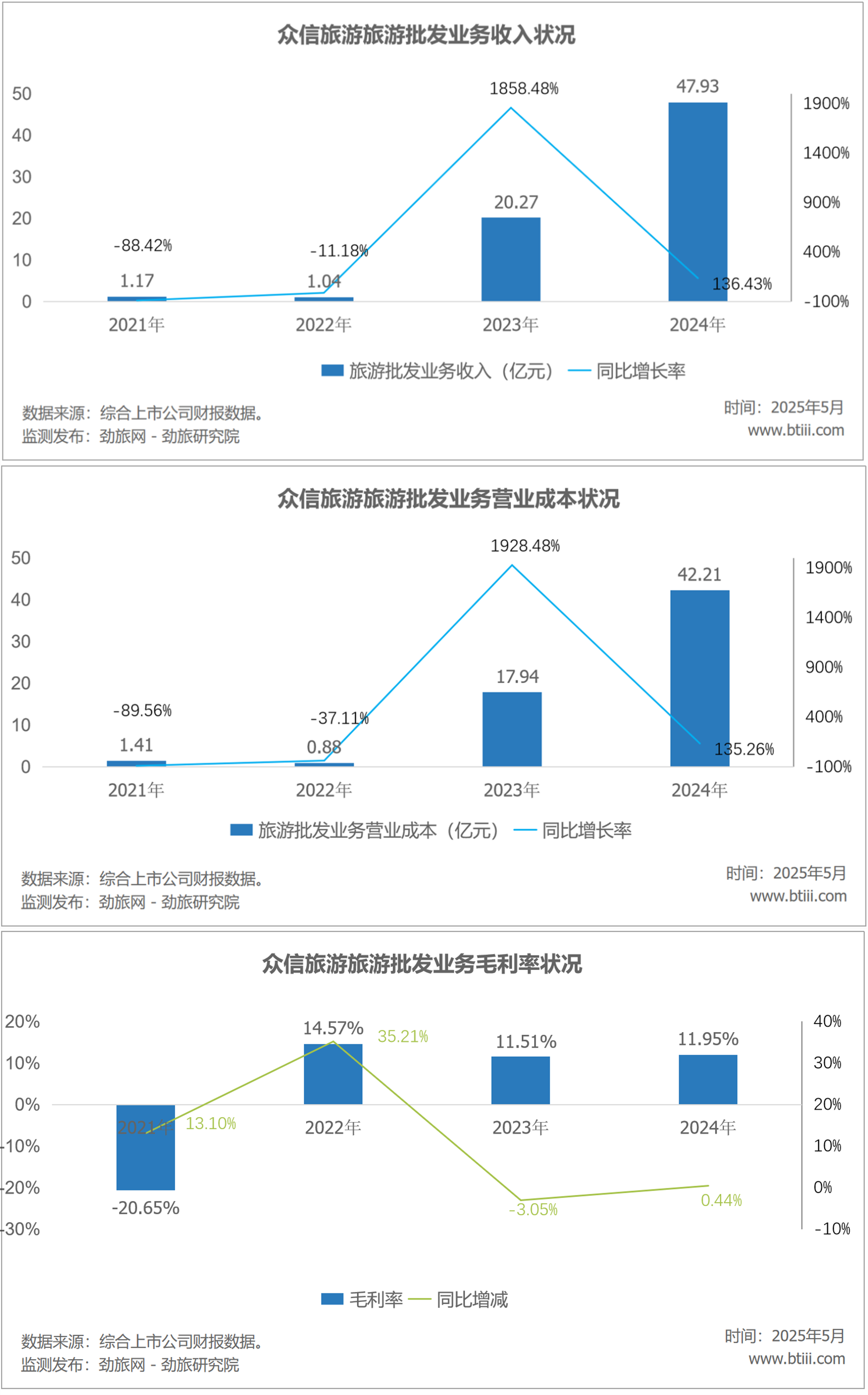 2024年,旅游批发业务收入47.93亿元,上年度为20.27亿元,同比增长136.43%。营业成本为42.21亿元,上年度为17.94亿元,同比增长135.26%。毛利率11.95%,上年度为11.51%,同比增长0.44个百分点。