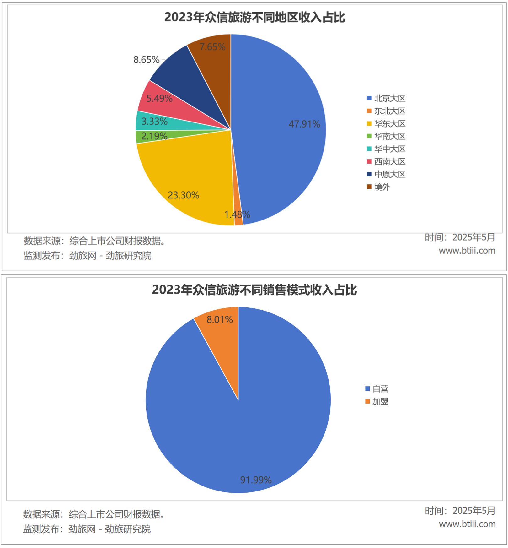 2023年,众信旅游北京大区收入占比为47.91%,东北大区收入占比为1.48%,华东大区收入占比为23.30%,华南大区收入占比为2.19%,华中大区收入比重为3.33%,西南大区收入占比为5.49%,中原大区收入占比为8.65%,境外收入占比为7.65%。自营模式收入占比为91.99%,加盟模式收入占比为8.01%。