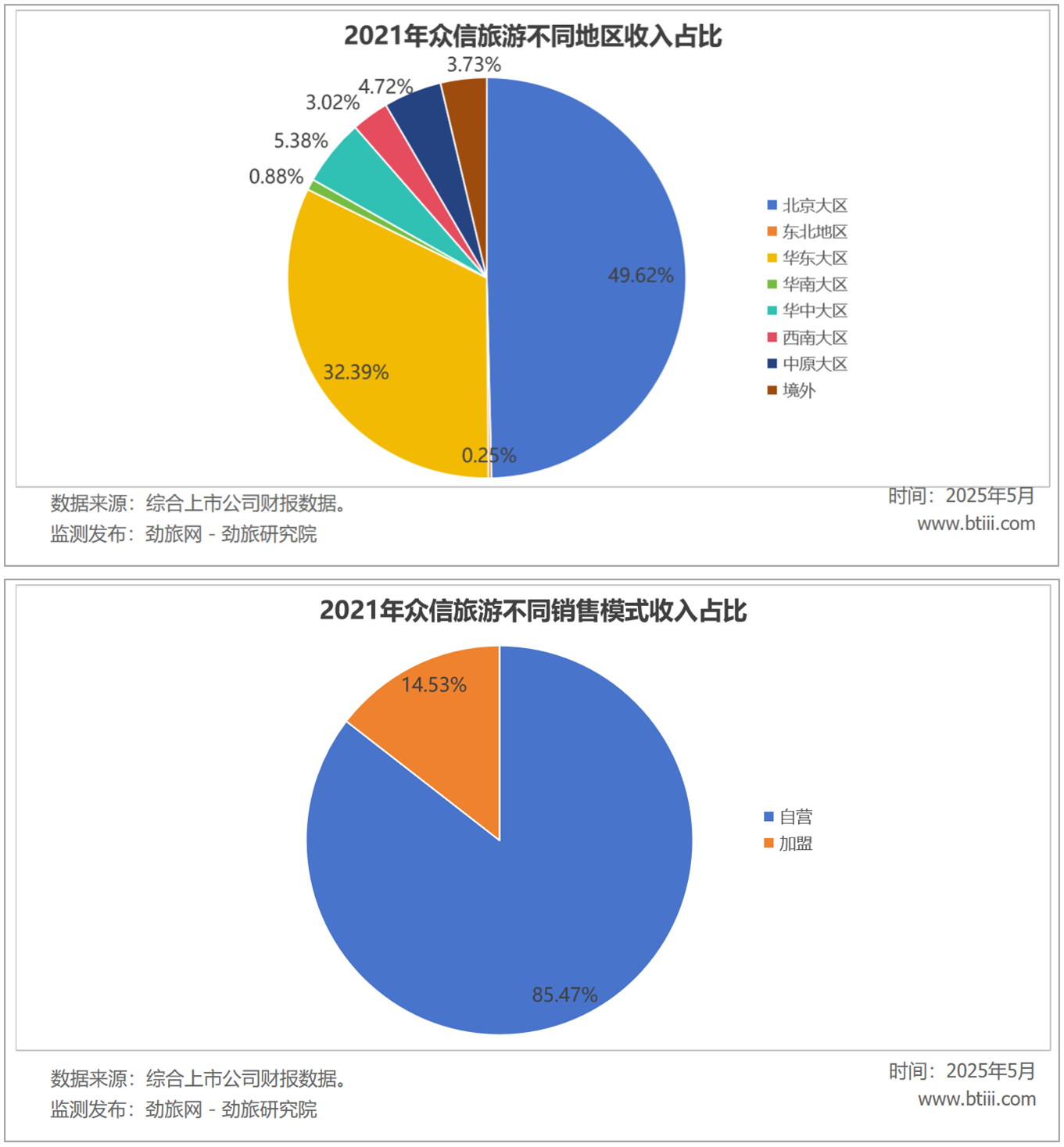 2021年,众信旅游北京大区收入占比为49.62%,东北大区收入占比为0.25%,华东大区收入占比为32.39%,华南大区收入占比为0.88%,华中大区收入占比为5.38%,西南大区收入占比为3.02%,中原大区收入占比为4.72%,境外收入占比为3.73%。自营模式收入占比为85.47%,加盟模式收入占比为14.53%。