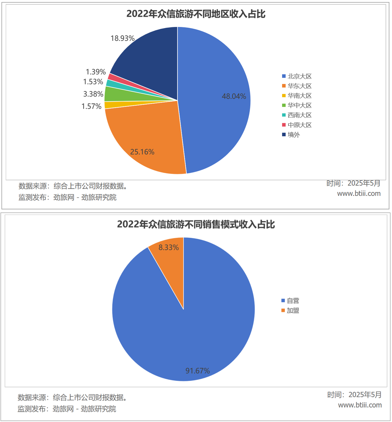 2022年,众信旅游北京大区收入占比为48.04%,华东大区收入占比为25.16%,华南大区收入占比为1.57%,华中大区收入占比为3.38%,西南大区收入占比为1.53%,中原大区收入占比为1.39%,境外收入占比为18.93%。自营模式收入占比为91.67%,加盟模式收入为8.33%。
