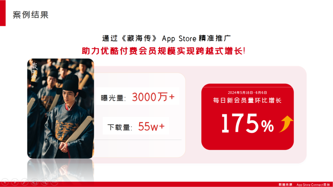 项目最终实现曝光量超3000万、应用下载量突破55万、每日新会员量环比激增175%,成功助力优酷付费会员规模实现跨越式增长。