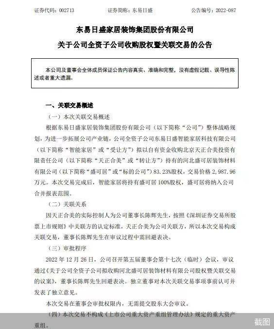 12月27日,北京商报记者从深圳证券交易所获悉,东易日盛家居装饰集团股份有限公司(简称“东易日盛”)发布公告称,东易日盛全资子公司东易日盛智能家居科技有限公司(简称“智能家居”)拟以2987.96万元收购北京天正合美投资有限责任公司(简称“天正合美”)持有的河北盛可居装饰材料有限公司(简称“盛可居”)83.23%股权,本次交易完成后,智能家居将持有盛可居100%股权。东易日盛称,“此次收购,是根据公司整体战略规划,是为了进一步拓展公司产业链。”