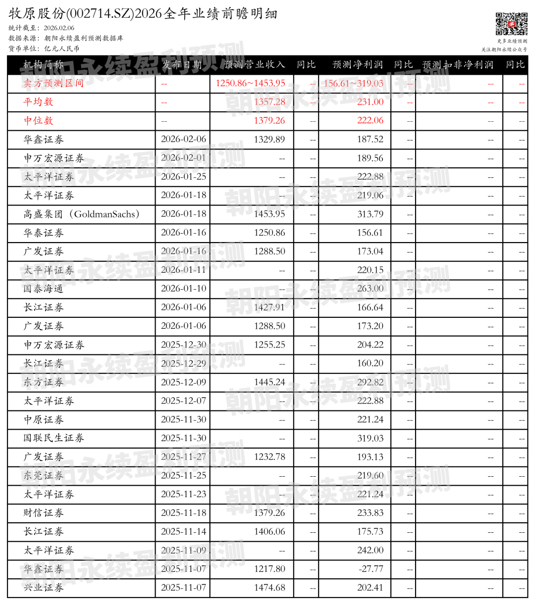 华鑫证券认为:牧原股份通过种源、饲料和管理三大基石构建了深厚的成本护城河,实现了种猪100%自供,饲料成本占比稳定在55%-60%,养殖完全成本降至行业领先水平。公司通过员工持股和股权激励绑定利益,融资与战略节奏高度匹配,聚焦生猪产能扩张。海外市场以越南为切口,屠宰业务产能利用率大幅提升,成为平滑周期、贡献利润的增长点。预计2026-2027年净利润在125.68~234.88亿元和273~393亿元,收入分别为1344.18、1329.89、1617.67亿元,EPS分别为2.84、3.43、5.98元。