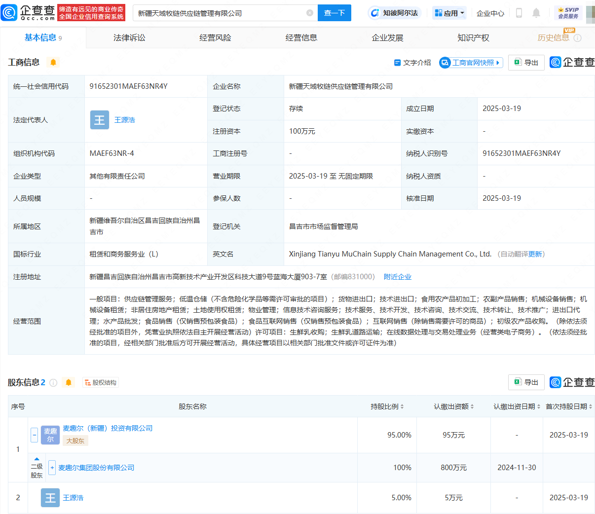 近日,新疆天域牧链供应链管理有限公司成立,法定代表人为王源浩,注册资本为100万元,经营范围包含:供应链管理服务;货物进出口;技术进出口;食用农产品初加工;农副产品销售;机械设备销售;水产品批发;食品销售等。股权穿透显示,该公司由麦趣尔(002719)旗下麦趣尔(新疆)投资有限公司、王源浩共同持股。