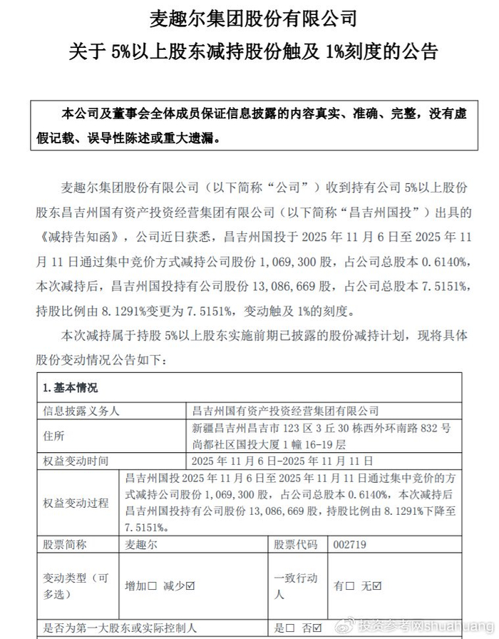 11月12日傍晚,麦趣尔的一则公告在乳业界掀起波澜。这家曾因“丙二醇事件”跌落神坛的新疆乳企披露,其重要国资股东昌吉州国有资产投资经营集团(下称“昌吉州国投”)已完成新一轮减持,持股比例从8.1291%降至7.5151%,正式跌破8%重要关口。公告细节显示,11月6日至11日短短6个交易日,昌吉州国投通过深交所集中竞价系统,累计抛售106.93万股,占到公司总股本的0.614%。