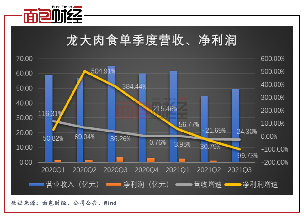 图2:2020年以来龙大肉食单季度营收、净利润及同比增速