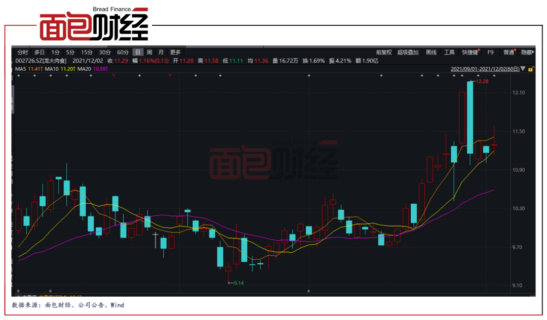实际上,龙大肉食股价于11月26日迎来涨停,当日收于12.11元/股。收到关注函后,股价大幅下跌7.93%。截至2021年12月2日收盘,公司股价收于11.20元/股,较公司近期提出子公司股权转让时股价涨幅超过10%。(PLH)
