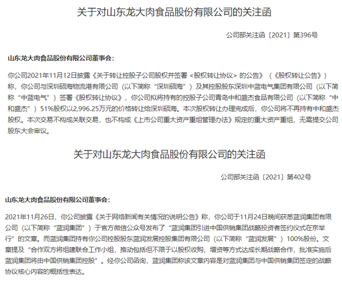 近期,龙大肉食资本动作频繁,先后披露子公司股权转让计划、控股股东蓝润集团公众号发表其与中国供销集团战略合作相关文章等事项,引来深交所的2份关注函。