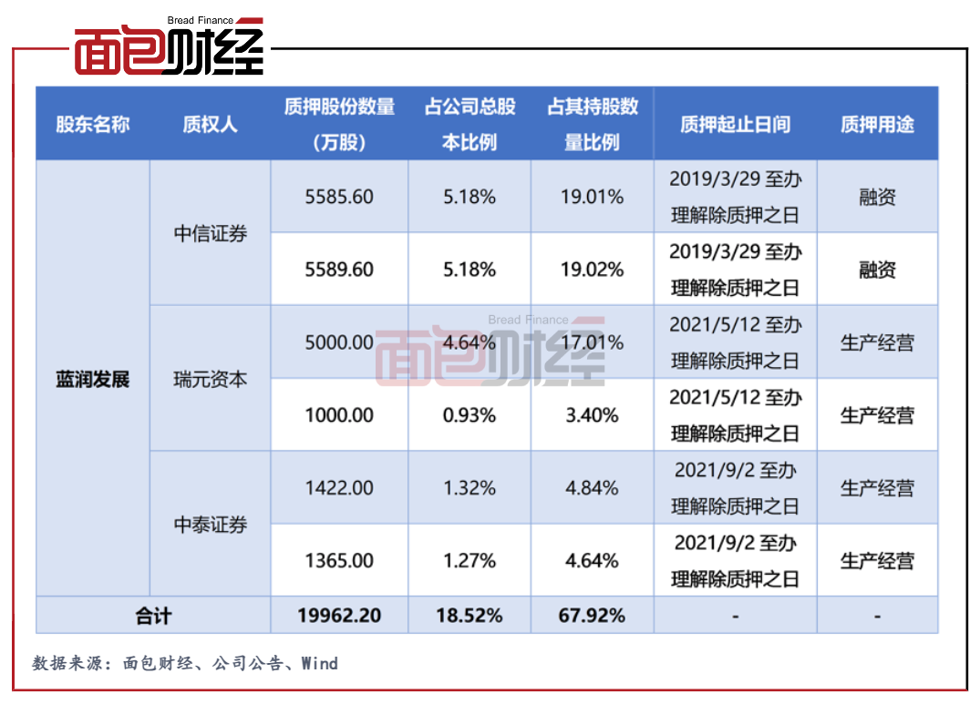 资料显示,截止回函日,蓝润发展持有公司股份293,885,800股,占公司总股本比例的27.25%。其中,质押股份占其持股比例的67.92%,质押比例较高,未来逾期或平仓风险仍需持续关注。