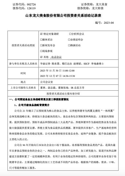 龙大美食向投资者介绍了公司食品主体战略背景及前三季度经营情况。公司自2021年确立了以预制菜为核心的食品主体,以养殖和屠宰为两翼支撑的“一体两翼”总体发展战略以来,持续加大食品板块的投入。食品业务包含预制菜和肉制品,主要面向预制菜,提供预制食材、预制半成品和预制成品三大品类产品。养殖和屠宰作为基础优势业务为食品做大做强提供重要支撑。养殖主要为食品提供品质溯源,屠宰提供共享客户、生产基地和经营网络来保障食品业务的稳定发展。公司未来将持续夯实食品业务,延伸产业链条,提升食品板块在主营收入的占比。