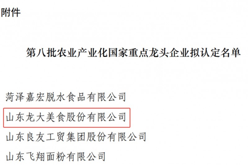 近日,农业农村部公布了第八批农业产业化国家重点龙头企业认定名单,龙大美食成功进入该名单。农业产业化国家重点龙头企业是根据中央关于“在全国选择一批有基础、有优势、有特色、有前景的龙头企业作为国家支持的重点”的要求,由农业农村部、国家发展改革委及商务部等多部门共同认定的企业。