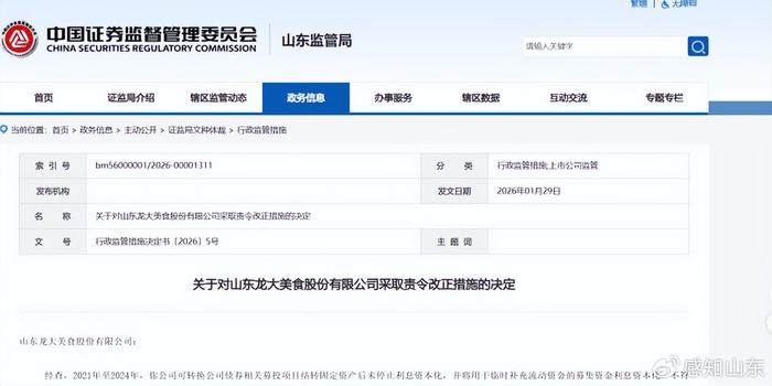 1月30日,证监会山东监管局官网披露的行政监管措施决定书〔2026〕5号显示,经查,2021年至2024年,山东龙大美食股份有限公司可转换公司债券相关募投项目结转固定资产后未停止利息资本化,并将用于临时补充流动资金的募集资金利息资本化,不符合《企业会计准则第17号——借款费用》第六条、第十四条的规定,导致相关定期报告信息披露不准确。