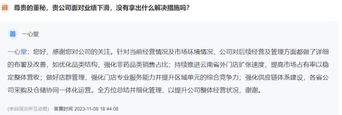 一心堂承认大规模的扩张会影响到利润之余,并未提及扩张到什么程度才会停止。实际上,2023年11月08日一心堂曾向投资者表示,面对公司业绩的下滑将会通过持续扩张,加以补救。