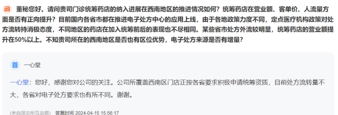 值得注意的是,4月15日,有投资者在平台中提问称,“请问贵司门诊统筹药店的纳入进展在西南地区的推进情况如何?统筹药店在营业额、客单价、人流量方面是否有正向提升?目前国内各省市都在推进电子处方中心的应用上线,由于各地政策力度不同,定点医疗机构政策对处方流转持消极态度,不同地区的药店在加入统筹前后的表现也不尽相同。某些省市处方外流较明显,统筹药店的营业额提升在50%以上。不知贵司所在的西南地区是否也有区位优势,电子处方来源是否有增量?”