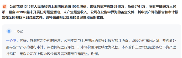而公司回复称,“公司本次与上海旭远消防签订股权转让协议,系经公司充分尽调,并聘请外部专业审计机构进行审计、评估机构进行评估,以市场价值评估结果为依据。本次合作主要对旭远消防名下资产进行盘活,用以公司在上海地区经营发展及药品存储配送。”