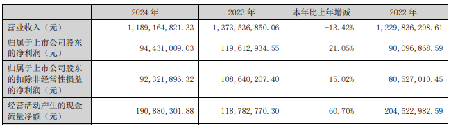 2024年,公司营业收入11.89亿元,同比减少13.42%;归属于上市公司股东的净利润9443.10万元,同比减少21.05%;归属于上市公司股东的扣除非经常性损益的净利润9232.19万元,同比减少15.02%;经营活动产生的现金流量净额1.91亿元,同比增长60.70%。
