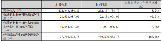 2025年第一季度,公司营业收入2.73亿元,同比增长8.24%;归属于上市公司股东的净利润2063.40万元,同比减少7.61%;归属于上市公司股东的扣除非经常性损益的净利润1998.48万元,同比减少8.86%;经营活动产生的现金流量净额3775.96万元,上年同期为-5950.07万元。