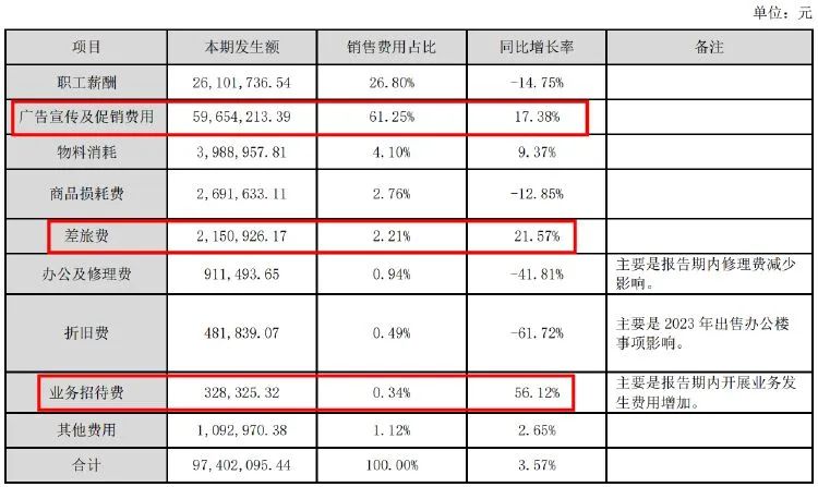 2024年上半年,燕塘乳业净利润下滑幅度远超营收下滑幅度,原因何在?记者通过半年报发现,上半年燕塘乳业销售费用同比仅增长3.57%,但是,广告宣传及促销费用5965.42万元,销售费用占比61.25%,同比增长17.38%;差旅费215.09万元,同比增长21.57%;业务招待费32.83万元,同比增长56.12%。