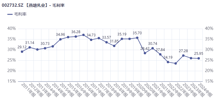 拉长时间看,燕塘乳业产品的毛利率也呈下降趋势,数据显示,2016年上半年公司毛利率曾达到36.28%,此后呈震荡下降趋势,2024年上半年毛利率跌到了25.59%。