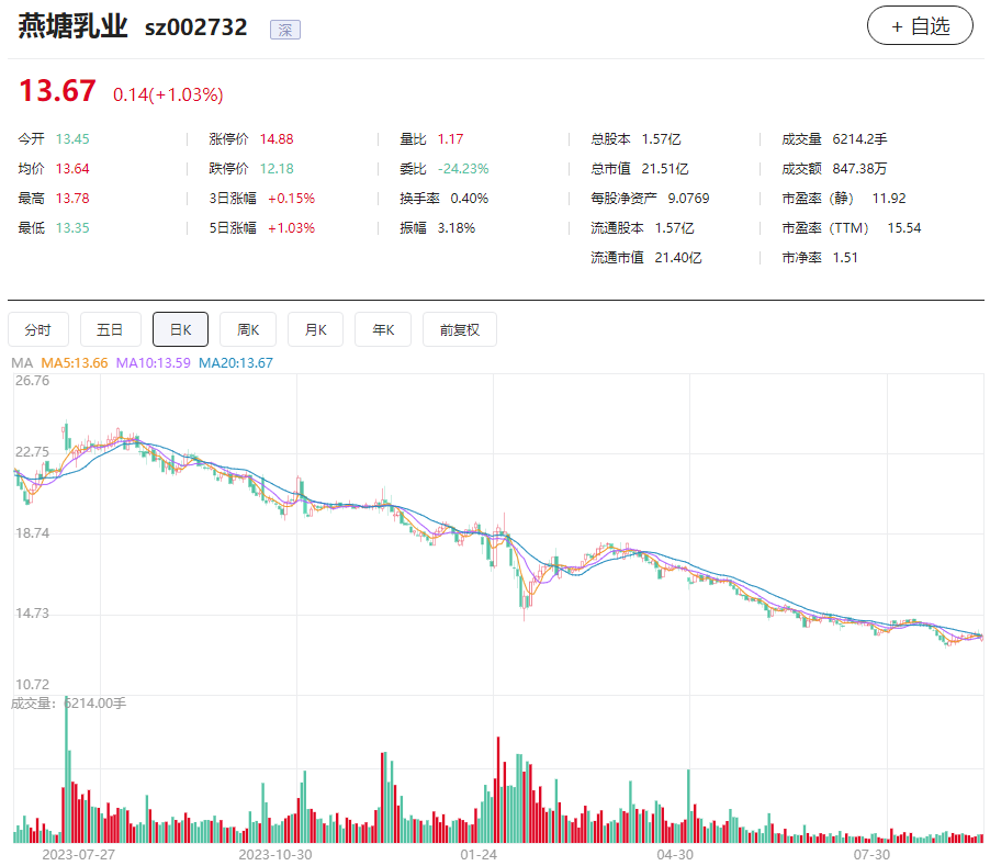 二级市场上,燕塘乳业的股价也经历了长期的震荡下滑。去年7月,公司股价曾达到24元/股左右的阶段高点,截至今年9月9日收盘,公司股价13.67元/股,一年多时间跌幅超40%,目前公司总市值21.51亿元。