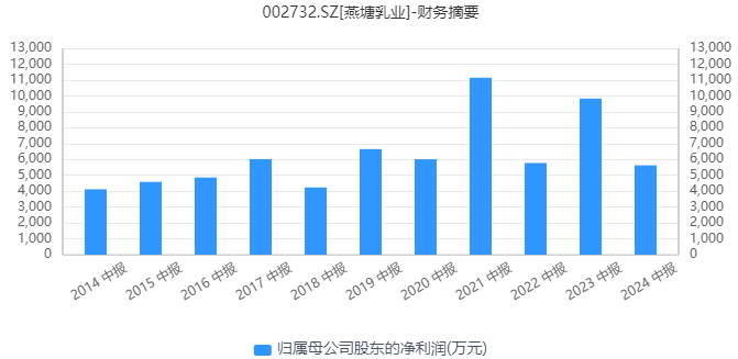 公司最近几年的营收整体稳步增长,但归母净利润则有所起伏。2023年,燕塘乳业实现营收19.50亿元,同比增长4.01%,归母净利润1.80亿元,同比大幅增长81.60%,创出上市后的最佳。但今年上半年的财报显示,今年的归母净利润超过去年或将有很大困难。