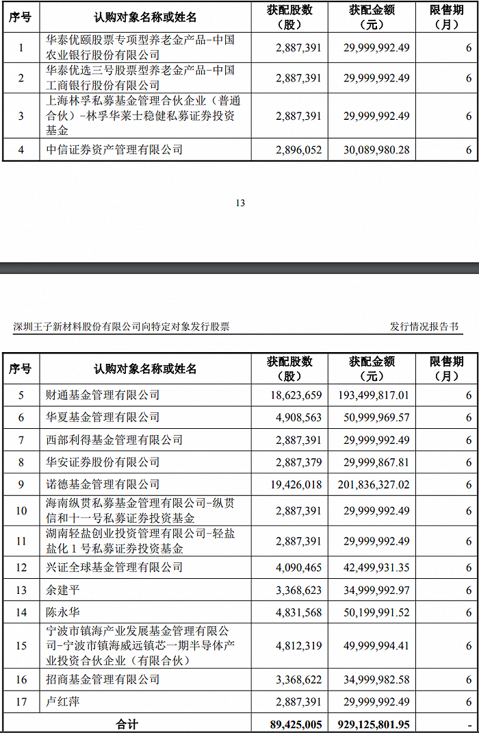 王子新材12月21日公告,本次非公开发行8942.5万股公司股份,发行价10.39元/股,募集资金9.29亿元。华泰优颐股票专项型养老金产品、财通基金、华夏基金等17家获配。