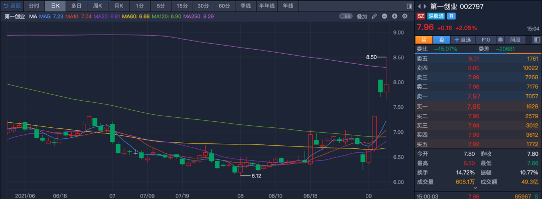 从股价表现来看,第一创业股价今年以来持续下跌,前8个月已经跌去35%。9月起公司股价大涨,在过去4个交易日中累计上涨22.6%。