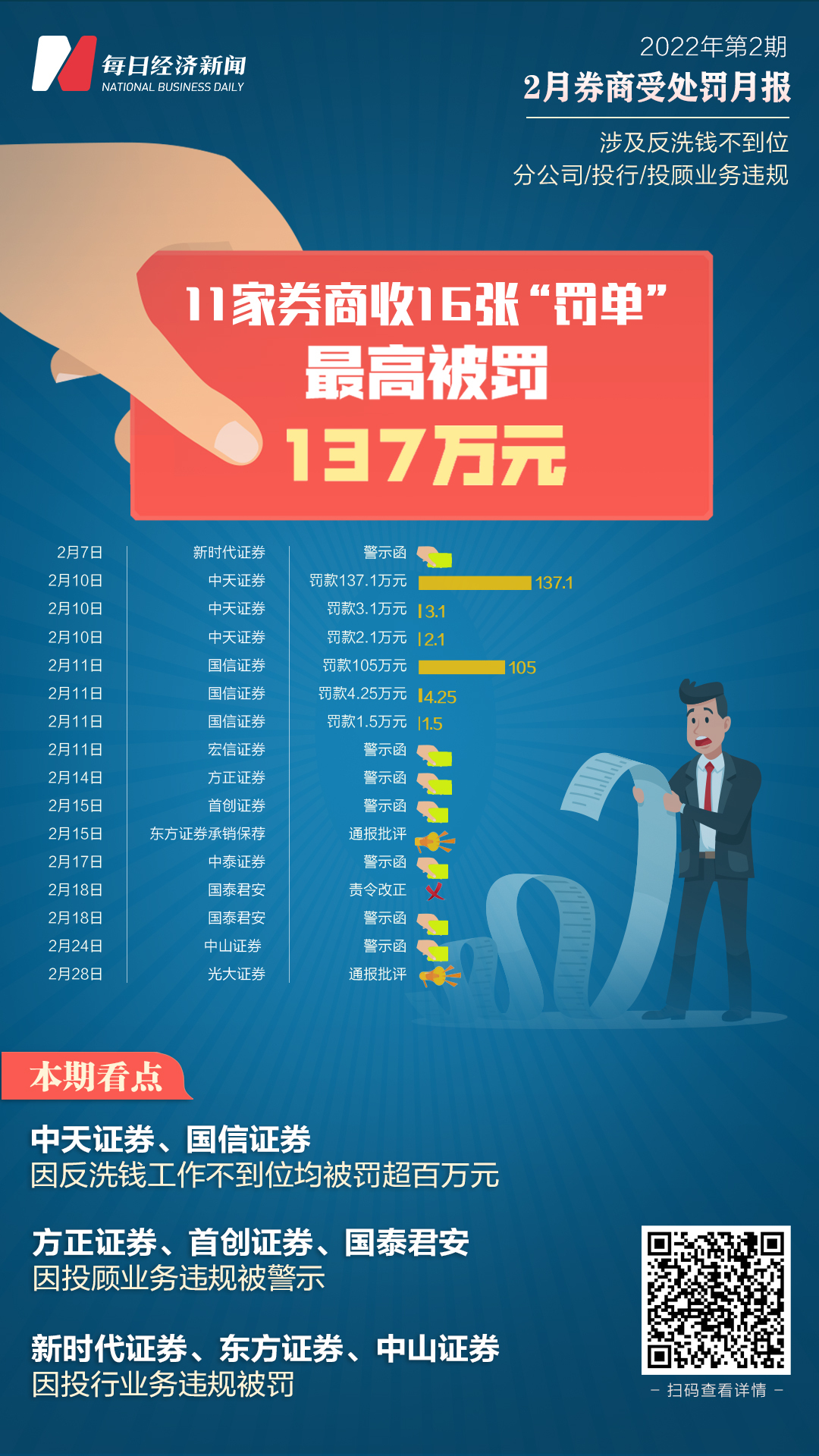 相比2022年1月的40余张证券行业罚单,2月就要少了许多。《每日经济新闻》记者统计显示,以落款日期计算,2022年2月,监管机构对证券行业共计开出了16张罚单,涉及11家券商,中天证券和国信证券各领到3张,皆因反洗钱工作不到位而受到处罚;其次是国泰君安,因分公司违规,涉及2张罚单。