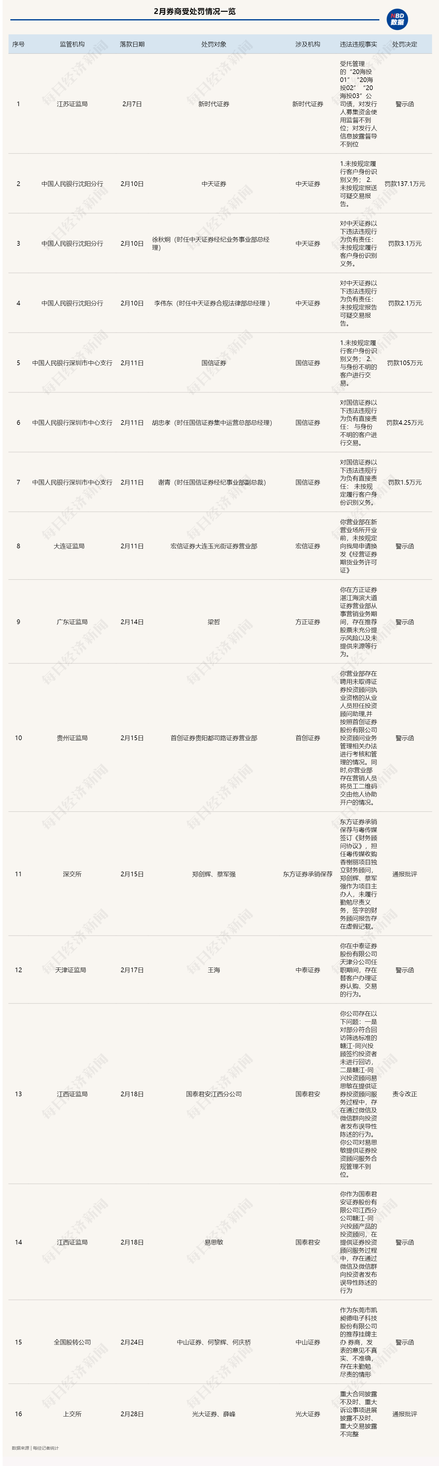 2月,有6张罚单指向券商反洗钱工作不到位,中天证券及2名责任人、国信证券及2名责任人因此受到处罚。