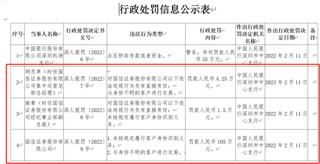 同时时任国信证券集中运营总部总经理胡忠孝对国信证券“与身份不明的客户进行交易”违规行为负有直接责任被罚款4.25万元;时任国信证券经纪事业部副总裁谢青对国信证券“未按规定履行客户身份识别义务”违规行为负有直接责任被罚款1.5万元。