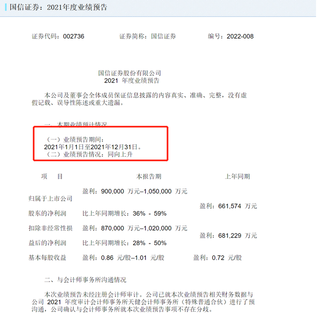 1月28日,国信证券发布了2021年度业绩预告公告,显示业绩预告期间为2021年1月1日至2021年12月31日,报告期内归属于上市公司股东的净利润盈利:900,000万元–1,050,000万元,比上年同期增长:36%- 59%;扣除非经常性损益后的净利润盈利:870,000万元–1,020,000万元,比上年同期增长:28%- 50%。