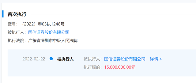 国信证券在整个券商行业中名列前排,但近日却是祸不单行,2022年2月22日,由于国信证券未按时履行法律义务被广东省深圳市中级人民法院强制执行,执行标的为1500万元。