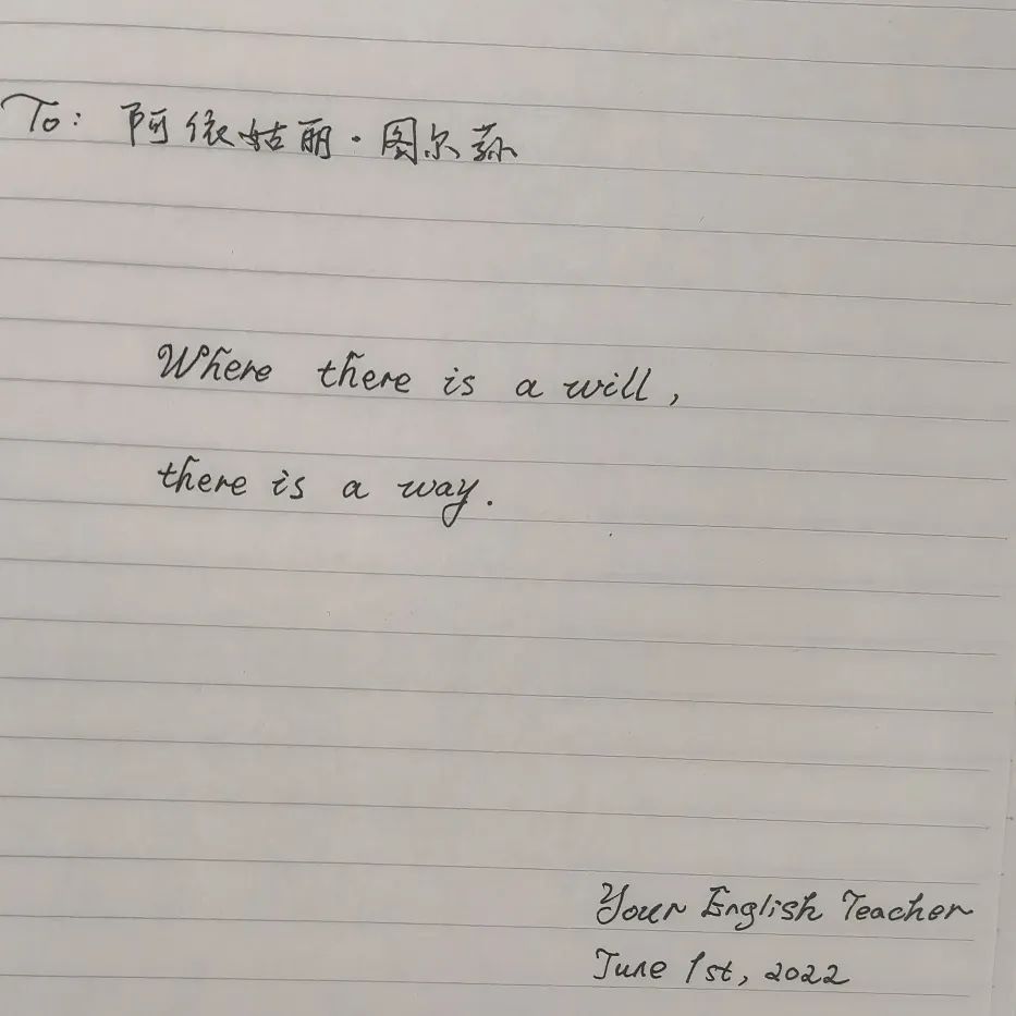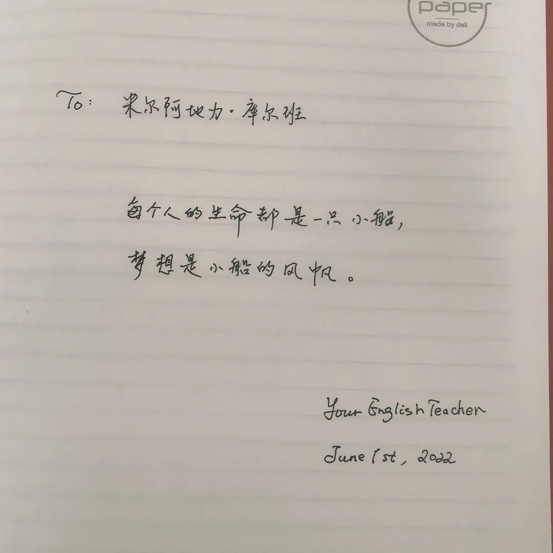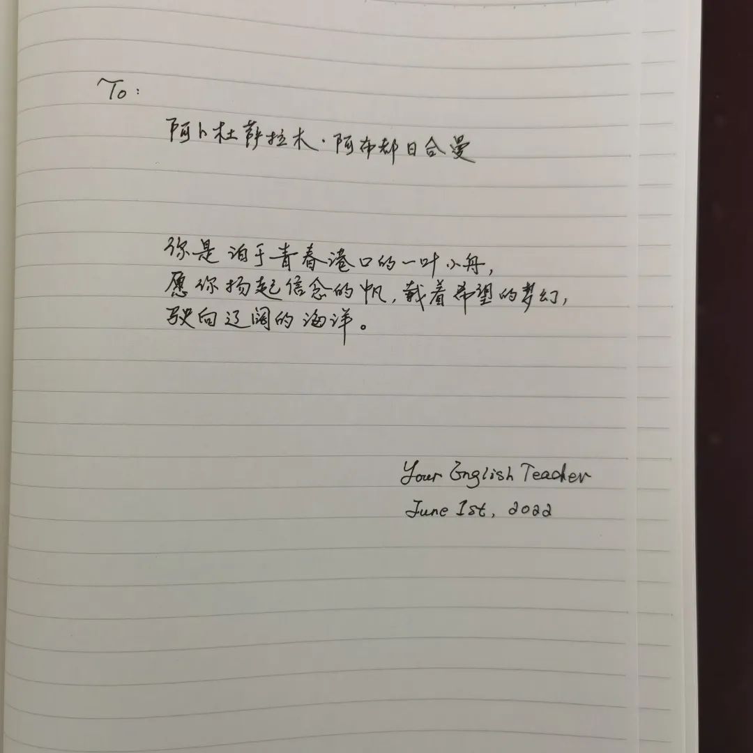 艾比布拉、伊力哈木是两个聪明但调皮的男孩,他们时而懂事,时而调皮,让我有点伤脑筋;木开热木是我的英语课代表,一个聪明伶俐又乖巧的漂亮女孩;谢姆西凯麦尔是班长,有大局观,早读时间会管着全班的同学读英语,有条不紊;还有,勤奋努力的学霸阿伊谢、孜拉莱,思维敏捷的阿卜杜萨拉木,在作文里写了我故事的阿卜杜热合曼……