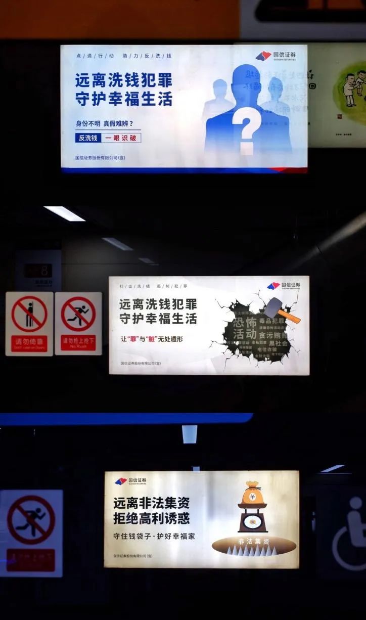 除了开通“反洗钱”地铁专列之外,围绕“远离洗钱犯罪,守护幸福生活”的宣传主题,国信证券在深圳地铁2号线部分站台(大剧院、市民中心、景田、红树湾、海上世界)还投放了反洗钱宣传灯箱广告,通过清晰明了、贴近生活的宣传图画,让广大市民们在等候列车的过程中学习反洗钱小知识,提高反洗钱意识,有效凝聚预防和打击洗钱犯罪的社会合力。