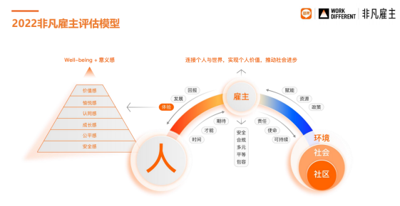 在猎聘的《2022非凡雇主评估模型》中提到:“非凡雇主从来不仅仅是知名企业的一次盛会,他应该是所有致力于非凡的企业展现自我的舞台.我们要寻找的是那些关注整个社会系统,真正以“人”为中心,连接个人与社会,帮助个人获得更愉悦的工作体验与生命意义,最终实现员工、企业、社会和谐共生、共同进化的非凡组织。