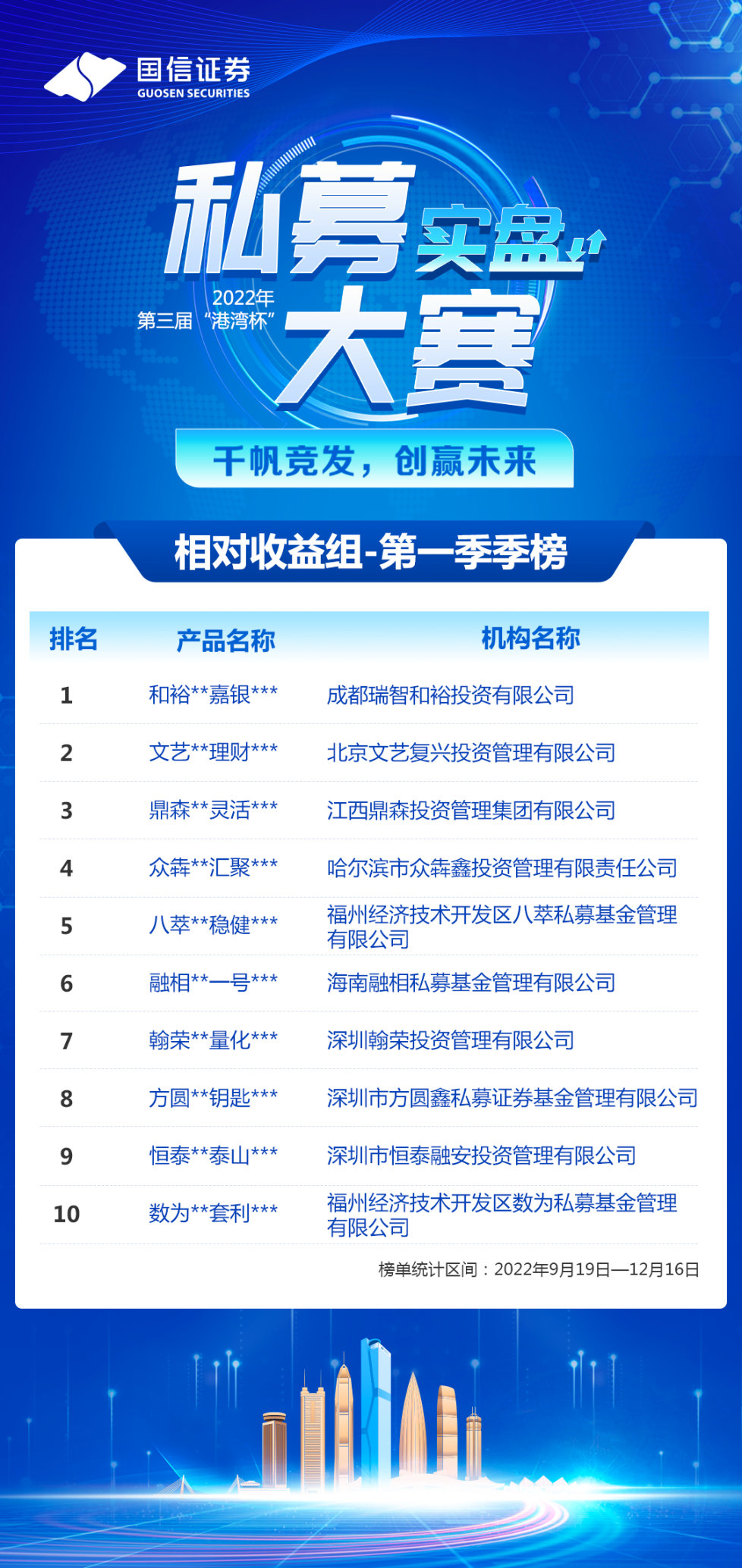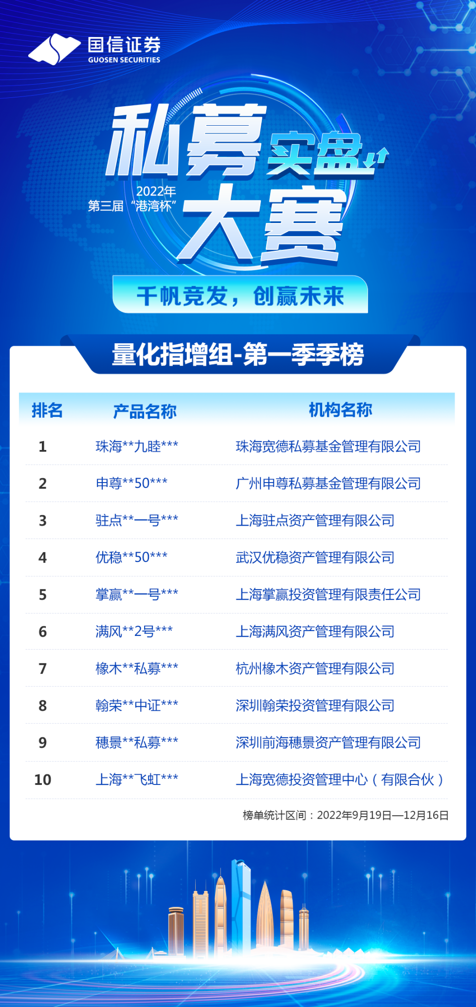 为支持有潜力的私募基金发展壮大,国信证券举办了第三届国信证券“港湾杯”私募实盘大赛,旨在为私募基金提供一个客观公平的竞技交流平台,遴选出优质私募机构和管理人。本次赛事为期六个月,2023年3月20日结束,期间持续开放报名。大赛分为股票多头组、量化指增组、相对收益组、CTA组和多策略组5个组别。