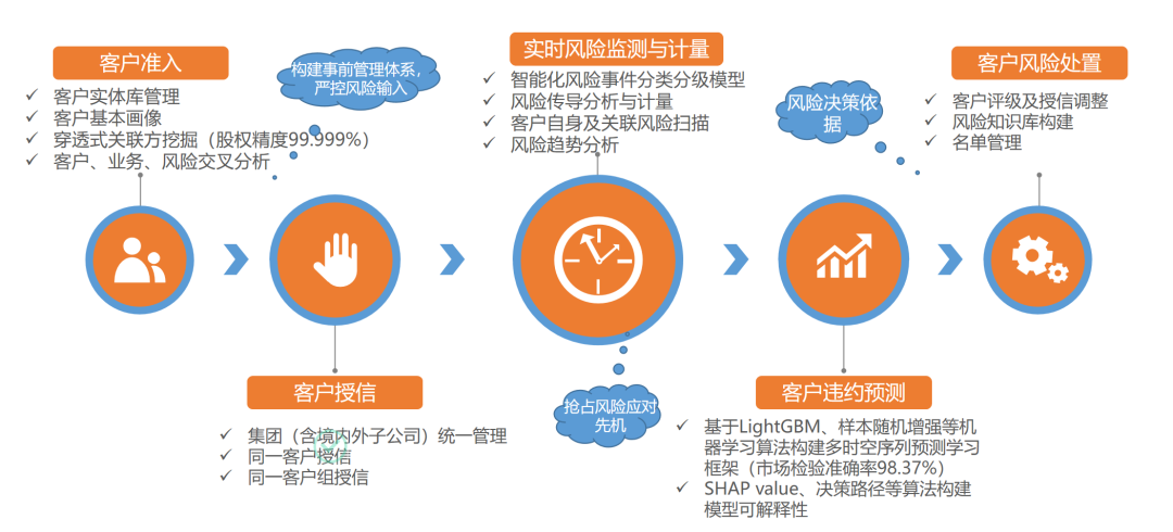 平台率先完成涵盖集团内外部2.7亿主体的同一客户/组的识别,构建起集团级客户数据库,并完成对统一授信、战发客户管理等多业务场景的有力支撑。平台构建的债券违约智能化预测体系,实现日频更新的前提下准确率提升至98.37%。最后通过风控中台输出可信稳定的riskAPI服务,推出涵盖API、订阅、Page等多类型450+支撑服务,构建起企业级信用风险管理经验沉淀及共享体系,为超过10个业务部门、1600+名用户提供应用级或用户级风险服务,有力地提升了信用风险管理的精准性、时效性和公司整体信用风险管理水平。