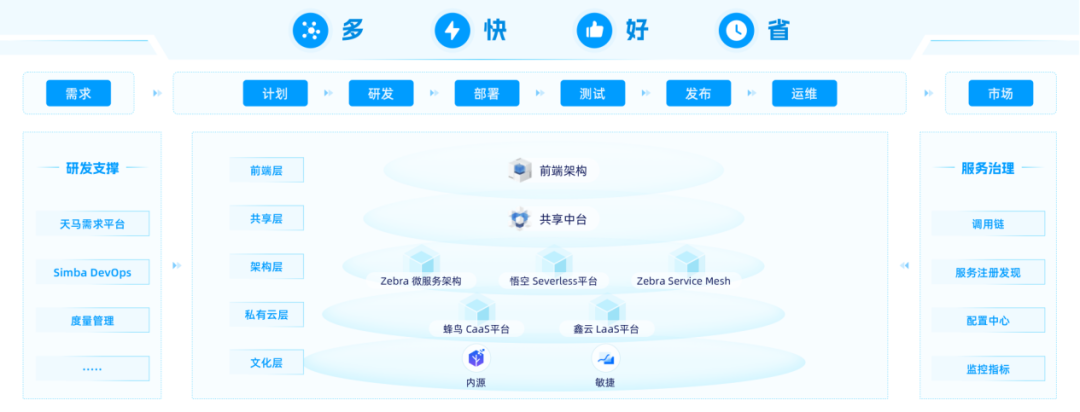 “擎天”证券数字化技术平台解决IT效能提升问题,实现IT价值交付的“多、快、好、省”。工程方面,平台以应用架构域、共享能力域、前端应用域为主体,研发支撑域和服务治理域为两翼,提供研发全生命周期的应用支撑。文化方面,平台在公司内部建设开放型内源虚拟组织,形成内部合作、资源共享、创新共赢的良性IT文化。