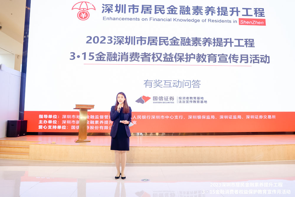 为切实强化市场经营主体投资者保护责任担当,做好消费者权益保护和投资者教育宣传工作,3月5日下午,在深圳市地方金融监督管理局、中国人民银行深圳市中心支行、深圳银保监局、深圳证监局、深圳证券交易所的指导下,由深圳市居民金融素养提升工程办公室主办、国信证券作为爱心支持单位联合举办的“2023深圳市居民金融素养提升工程3·15金融消费者权益保护教育宣传月活动”在深圳中心书城开展,国信证券投资者、深圳中心书城书友积极参与了本次活动。