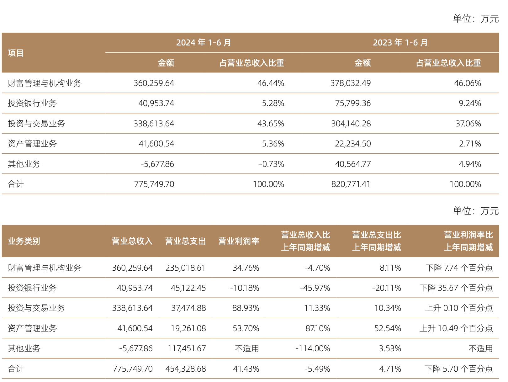 国信证券主要从事证券财富管理与机构业务、投资银行业务、投资与交易、资产管理四大主营业务。今年上半年,财富管理与机构业务、投资银行业务出现不同程度下滑,而投资与交易、资产管理业务实现了业务正增长。