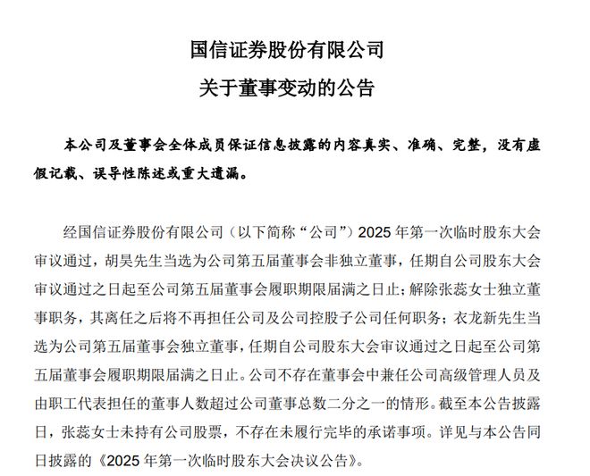 据悉,经国信证券2025 年第一次临时股东大会审议通过,胡昊当选为第五届董事会非独立董事;解除张蕊女士独立董事职务;衣龙新当选为第五届董事会独立董事。