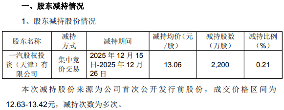 一汽投资率先完成减持计划,2025年12月15日-12月26日期间以均价13.06元/股减持2200万股,占总股本的0.21%,共套现约2.87亿元。值得关注的是,一汽投资此前已经减持三轮,七年多四轮减持共套现近30亿元。