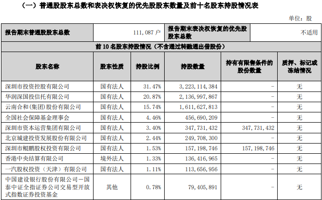 截至2025年三季度末,国信证券共有11.1万户普通股股东,其中,深圳市投资控股有限公司(简称“深投控”)持有33.53%股,为第一大股东,持股5%以上的股东还有2家,除了华润信托持有的20.87%股份外,云南合和(集团)股份有限公司持有16.77%股份。