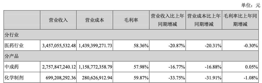 主营业务分产品情况方面,中成药的营业收入为27.58亿元,同比下降16.77%,毛利率为57.98%,同比增加0.05%;化学药剂的营业收入为6.99亿元,同比下降33.75%,毛利率为59.87%,同比减少1.08%。