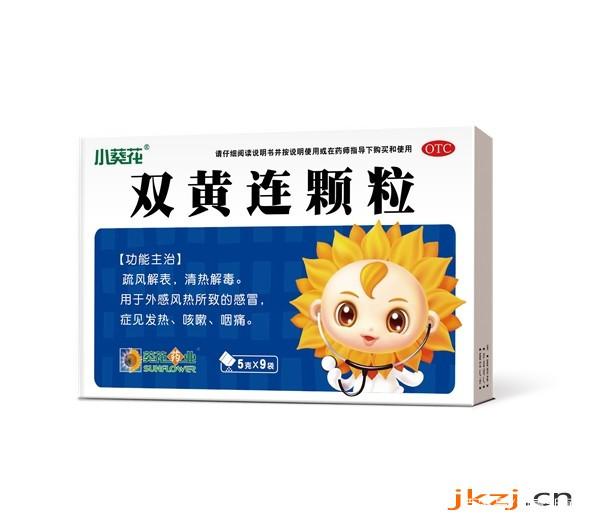 小葵花“双黄连颗粒”由黄芩、连翘、金银花等联合组成,具有提高免疫、清热解毒、表里双清、清除里热外热的功效,可用于小儿风热感冒引起的发热、咳嗽、咽痛
