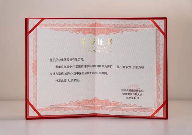 近期,由中国医药卫生文化协会、国家卫生健康委员会百姓健康频道(CHTV)主办,中国医院协会医院健康促进专业委员会、中国医药卫生文化协会卫生健康传播分会协办的2024健康中国传播大会在北京举办。会上,凭借广泛的品牌影响力与社会价值表现,葵花药业成功入选“中医药品牌影响力100案例”,传递出葵花品牌强大的消费者忠诚度及市场认可度。