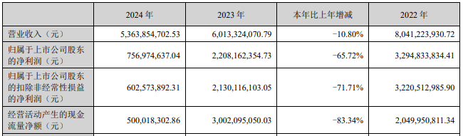 2024年,中矿资源营业收入为53.64亿元,同比下降10.80%;归属于上市公司股东的净利润7.57亿元,同比下降65.72%。