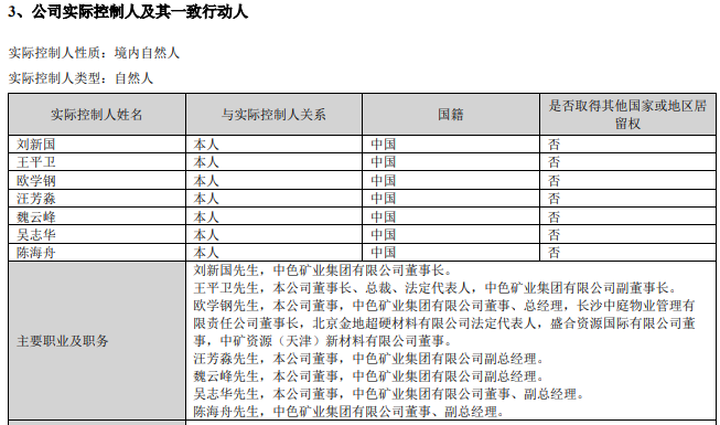 中色矿业集团有限公司是公司控股股东,刘新国、王平卫、欧学钢、汪芳淼、魏云峰、吴志华、陈海舟7人是公司的共同实际控制人。