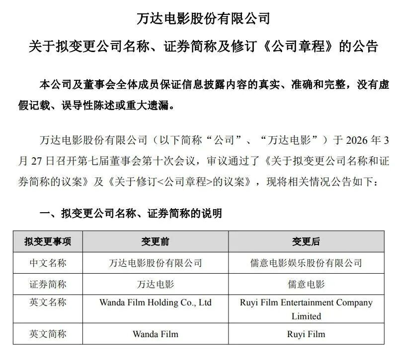 近日,万达电影正式公告拟更名为“儒意电影娱乐股份有限公司”,证券简称同步变更为“儒意电影”。