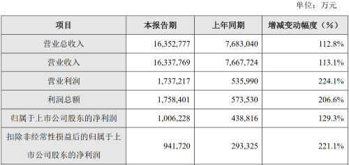 报告期内,京东方实现营业总收入约2194.4亿元,同比增长61.89%;营业利润为345.8亿元,比增长472.09%;利润总额为346.6亿元,比增长468.79%;归属于上市公司股东的净利润为258.3亿元,同比增长412.86%。